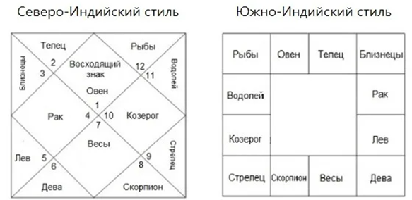 Так, в большинстве, отображаются натальные карты в ведической астрологии. Часто астрологи выбирают только один. Мы с вами будем рассматривать натальные карты в северо-индийском стиле (карта слева). Внутри каждого деления (ромба или треугольника) есть нумерация. Это — номера знаков: 1 — Овен, 2 — Телец, 3 — Близнецы и т.д. (против часовой стрелки). В нашем примере они совпадают с номерами домов. Дома, как правило, не нумеруются! Они постоянны и изначально составляют строгую структуру. 1-й — Восходящий знак (Лагна), 2 — слева от него и т.д.